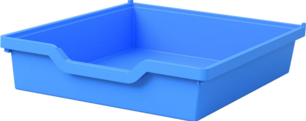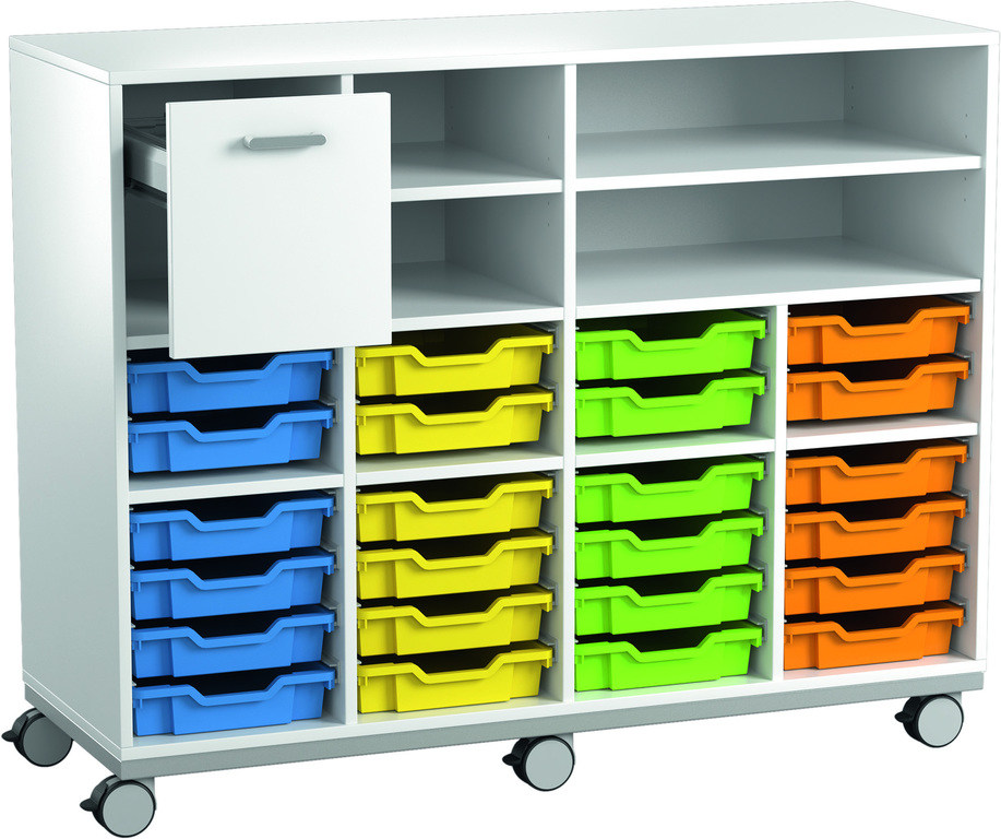 Rechts: oben 2 breite Ablagefächer, darunter 2 Abteile mit je 6 Schienenpaaren für Materialboxen