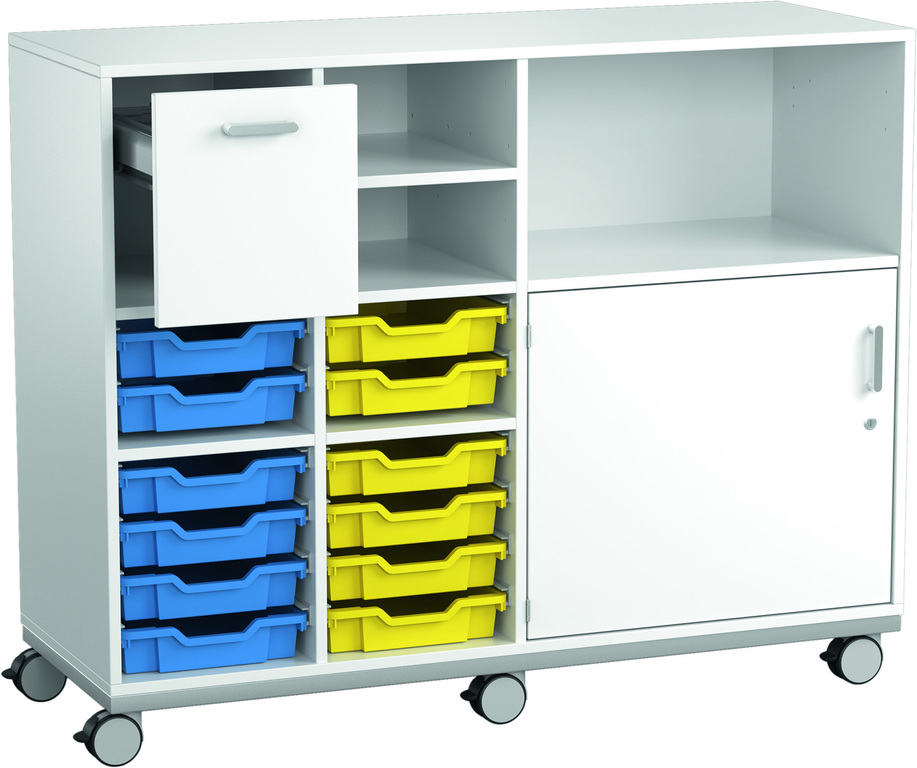 Der Lernjobwagen/Lernjobschrank 3 ist mit insgesamt 12 Schienenpaaren für Materialboxen, einem Hängeregistraturauszug, drei offenen Schrankfächern und einem Schrankfach mit Einlegeboden und Drehtür mit Zylinderschloss ausgestattet. Als Schrankunterbau sind Kantfüße für eine feststehende Verwendung oder Schwenkrollen für die mobile Verwendung auswählbar.