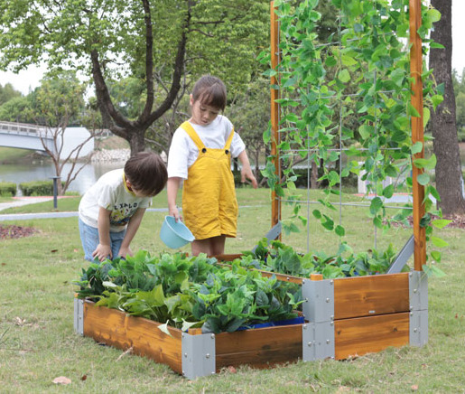 Wo und wie wächst das Gemüse? Spannende Fragen lassen sich mit diesem stabilen und langlebigen mehrstufigen Hochbeet mit Rankgitter behandeln. Die Kinder werden zu kleine Gärtnern, übernehmen die Verantwortung für die Pflanzen und haben gleichzeitig Spaß daran, diese zu hegen und zu pflegen.