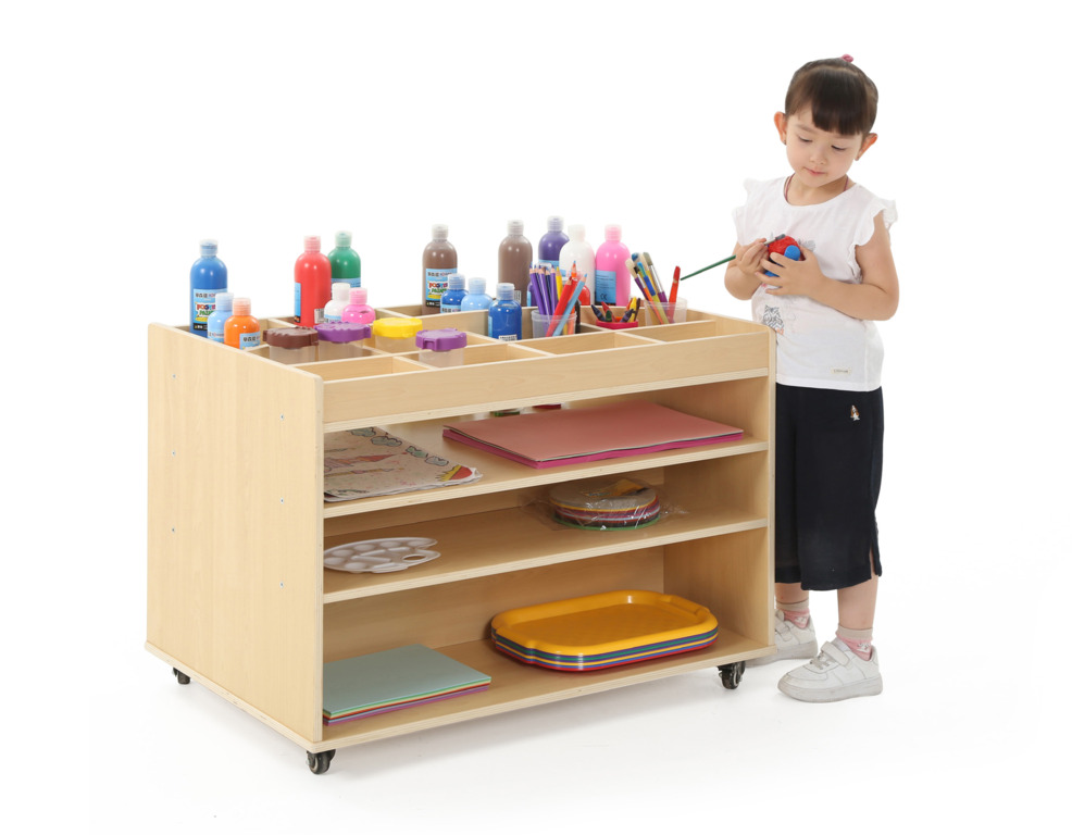 die Fachböden und die Ablagefächer bieten viel Stauraum und Abstellfläche für Scheren, Pinsel, Farbflaschen, Papier etc.