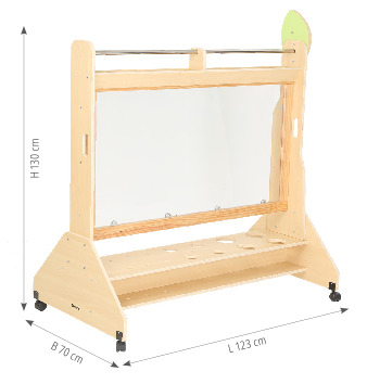 Ob auf Papier oder auf der transparenten Fläche - hier können kleine Künstler ihrer Kreativität freien Lauf lassen. Durch die Ausstattung mit vier leichtgängigen Rollen kann die Staffelei schnell und unkompliziert dorthin gebracht werden, wo sie gerade gebraucht wird und während der Benutzung durch die Betätigung der Feststeller sicher und stabil zu stehen. Die großzügige Ablage bietet reichlich Platz für eine übersichtliche Unterbringung der Malutensilien.