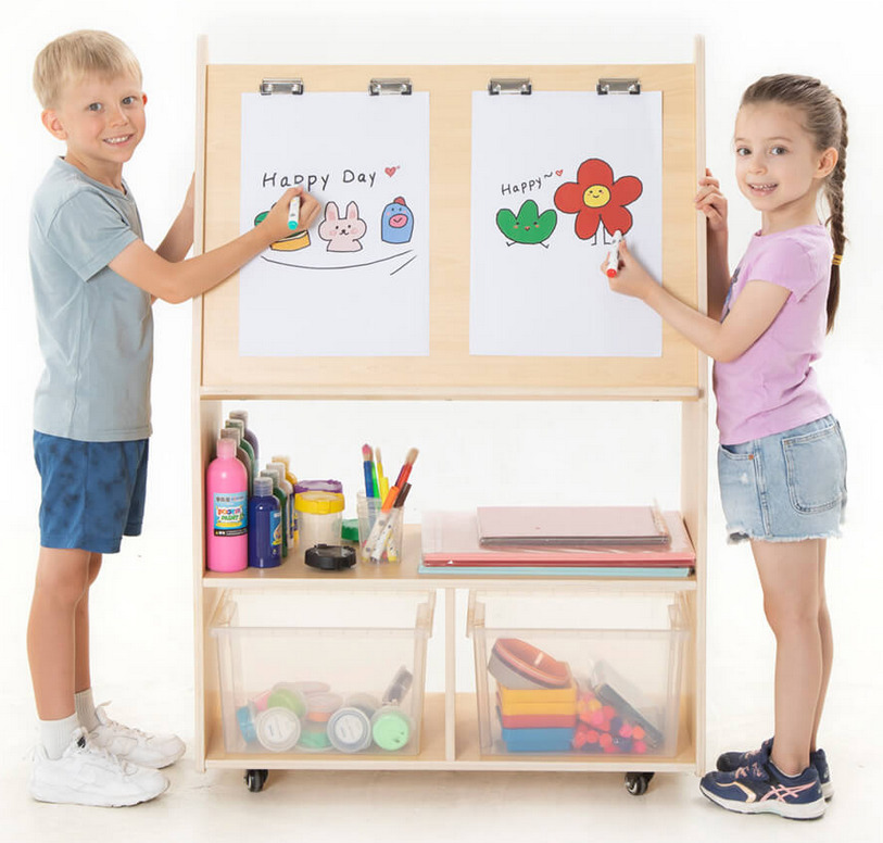 Die innovative mobile Staffelei ist die perfekte Lösung für kreative Aktivitäten in jeder Kindertagesstätte, sowohl hinsichtlich der Funktionalität als auch des kindgerechten Designs. Durch die Ausstattung mit vier leichtgängigen Rollen kann die Staffelei schnell und unkompliziert dorthin gebracht werden, wo sie gerade gebraucht wird und während der Benutzung durch die Betätigung der Feststeller sicher und stabil zu stehen. Die doppelseitige Konstruktion mit Klemmvorrichtung für je 2 Malblätter pro Seite ermöglicht, dass bis zu vier Kinder zur gleichen Zeit malen und zeichnen können. Die großzügigen Ablagefächer bieten reichlich Platz für eine übersichtliche Unterbringung der Malutensilien.