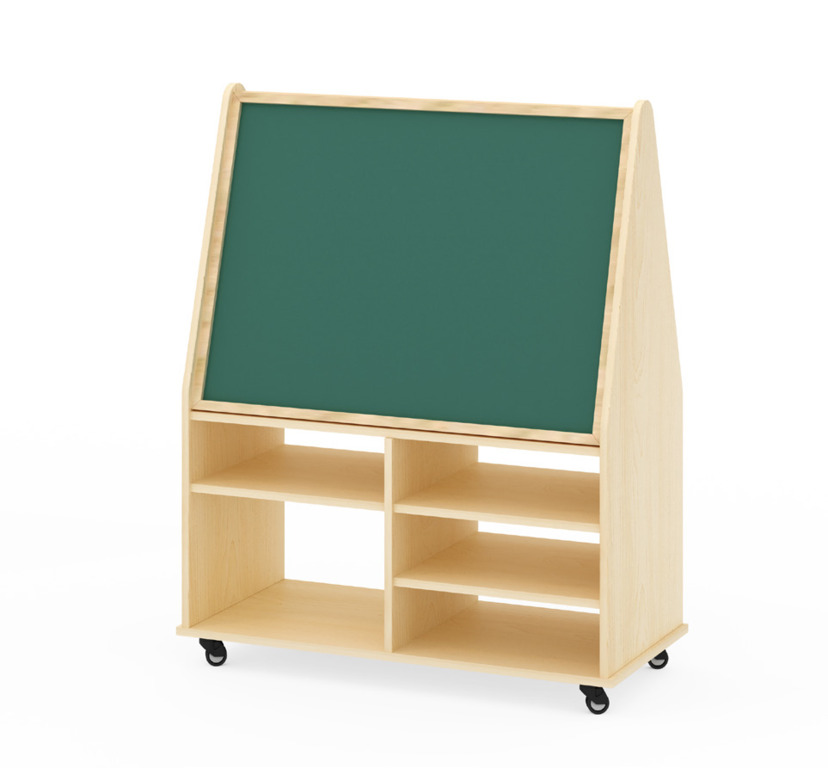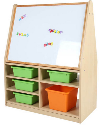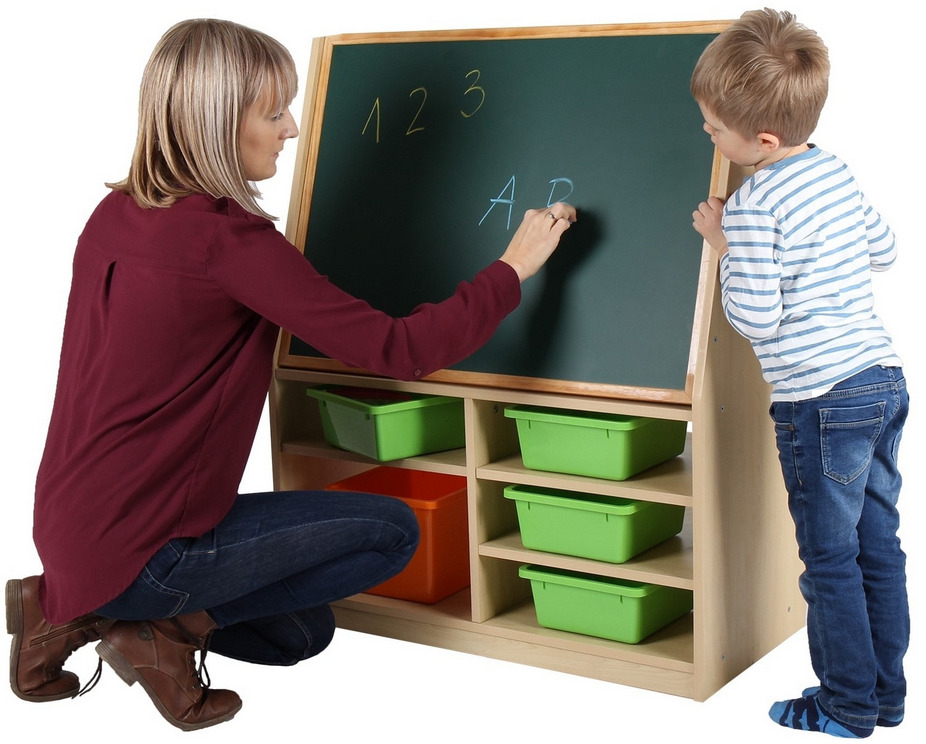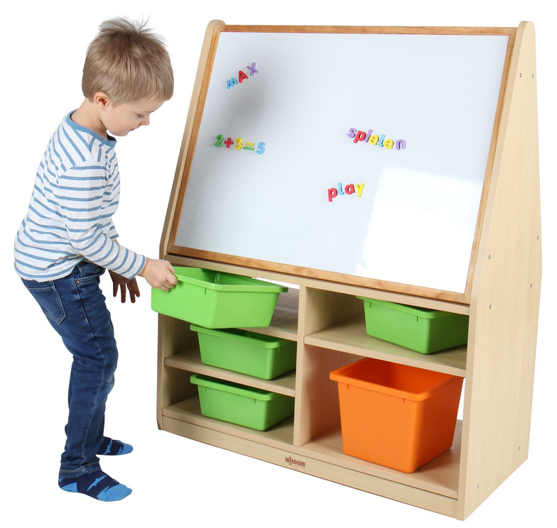 Die innovative Regalkombination mit Tafeln ist die perfekte Lösung für kreative Aktivitäten in jeder Kindertagesstätte. Eine Seite ist mit einer Kreidetafel ausgestattet, die andere Seite mit einer Magnettafel. Die großzügigen Ablagefächer bieten reichlich Platz für eine übersichtliche Unterbringung der benötigten Utensilien. Durch die Ausstattung mit vier leichtgängigen Rollen kann die Regalkombination schnell und unkompliziert dorthin gebracht werden, wo sie gerade gebraucht wird und während der Benutzung durch die Betätigung der Feststeller sicher und stabil zu stehen. Die passenden Boxen sind ebenfalls in unserem Shop erhältlich.