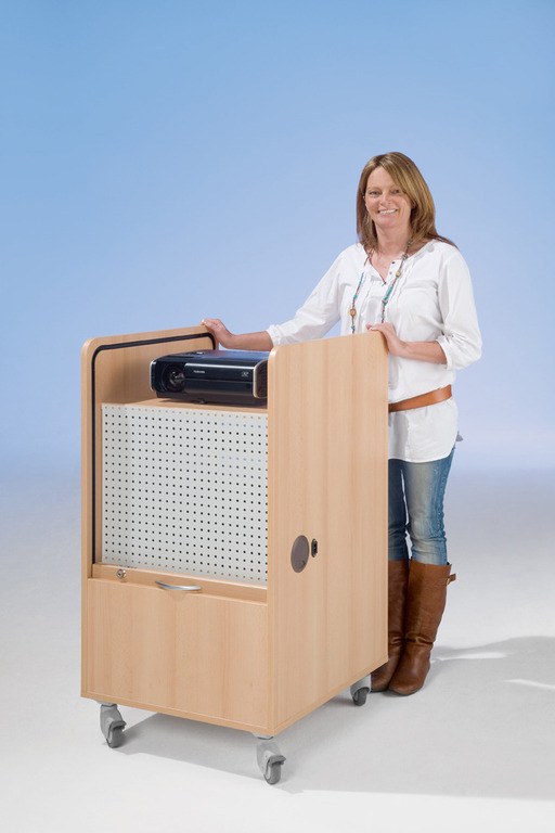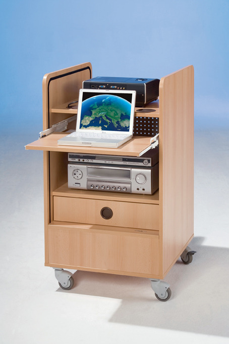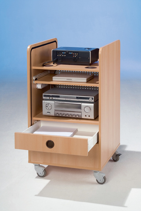 Durch die Lochblechwand bekommen die Geräte immer genug Luft und sind so vor Überhitzung geschützt. Der Wagen steht auf 4 belastbaren Leichtlaufrollen, von denen 2 feststellbar sind, so ist er mobil einsetzbar.