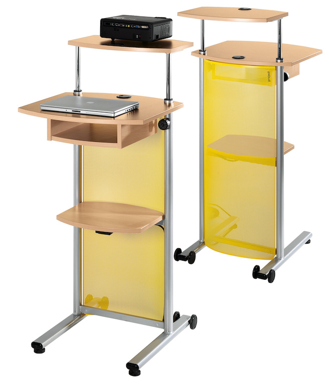 Das Medienmobil multitec ist ein fahrbarer Steharbeitsplatz für Laptop und Beamer und kann bei versenkter Beamerstellfläche auch als Rednerpult verwendet werden.