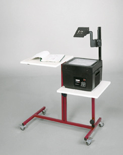Der Wagen hat eine Plattengröße von 50 x 45 cm, ausreichend für alle Gerätetypen. Eine Platte ist am stabilen Stahlrohrgestell in 80 cm Höhe fest montiert, die andere in der Höhe verstellbar. Das erlaubt bequemes Arbeiten am Projektor - im Sitzen oder im Stehen.