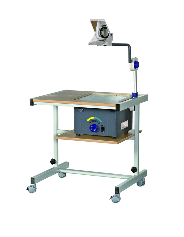 Projektorwagen C-Fuß-Gestell und Schreibablage. Dieser höhenverstellbare OHP-Projektorwagen mit C-Fuß-Gestell bietet durch seine große Arbeitsplatte neben der Projektorfläche viel Platz zur Ablage von Unterrichtsmaterialien. Der Projektor steht versenkt auf einer 2. Platte. Durch den Ausschnitt in der oberen Platte schließt die Projektorfläche bündig mit der Arbeitsfläche ab. 4 starke Doppelrollen (2 davon feststellbar) gewährleisten einen mobilen Einsatz. Der Plattenausschnitt richtet sich nach dem eingesetzten Projektor.