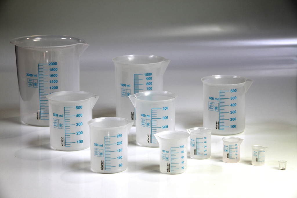 Messbechersatz bestehend aus insgesamt 11 Teilen: 2000, 1000, 600, 500, 400, 250, 100, 50, 25, 10 und 1 ml.
