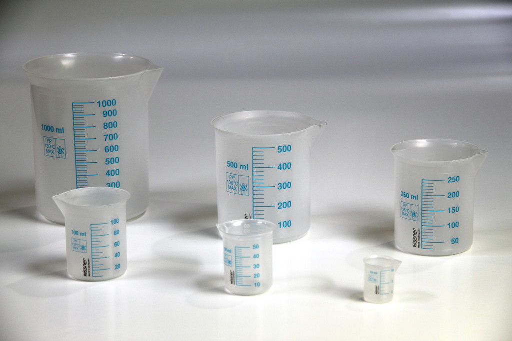 Messbechersatz bestehend aus insgesamt 6 Teilen: 1000, 500, 250, 100, 50 und 10 ml.