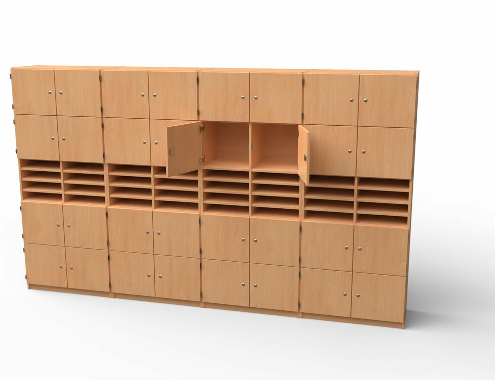 Das Schrankwand-Set SIMONE ist eine platzsparende und durchdachte Lösung für Lehrerzimmer und Büros. Mit Gesamtmaßen von 320 x 190 x 40 cm bietet es ausreichend Stauraum für Lehrmaterialien und persönliche Gegenstände. Das Set besteht aus vier Lehrerfachschranken (BxHxT 80 x 190 x 40 cm), wovon zwei mit je vier abschließbaren Fächern und zwei mit je vier offenen Postfächern ausgestattet sind. Diese Kombination aus verschließbaren und offenen Fächern ermöglicht eine organisierte Aufbewahrung und erleichtert den Zugriff auf häufig verwendete Gegenstände.