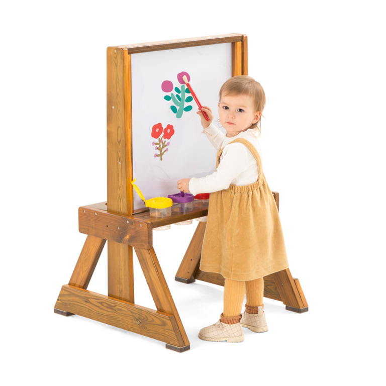 Diese robuste Outdoor-Maltafel wurde speziell mit Blick auf unsere Kleinsten konzipiert und bietet eine sichere und kreative Spielumgebung für Kinder unter drei Jahren. Die Aussparungen in der Ablage ermöglichen ein sicheres Unterbringen von Malbechern und weiteren Malutensilien.