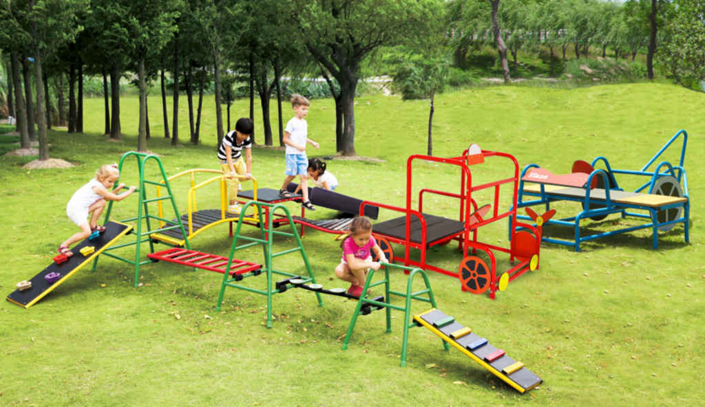 Hier ein Beispiel einer individuell zusammengestellten OXYGYM Spielanlage in Form eines spannenden und abwechslungsreichen Parcours