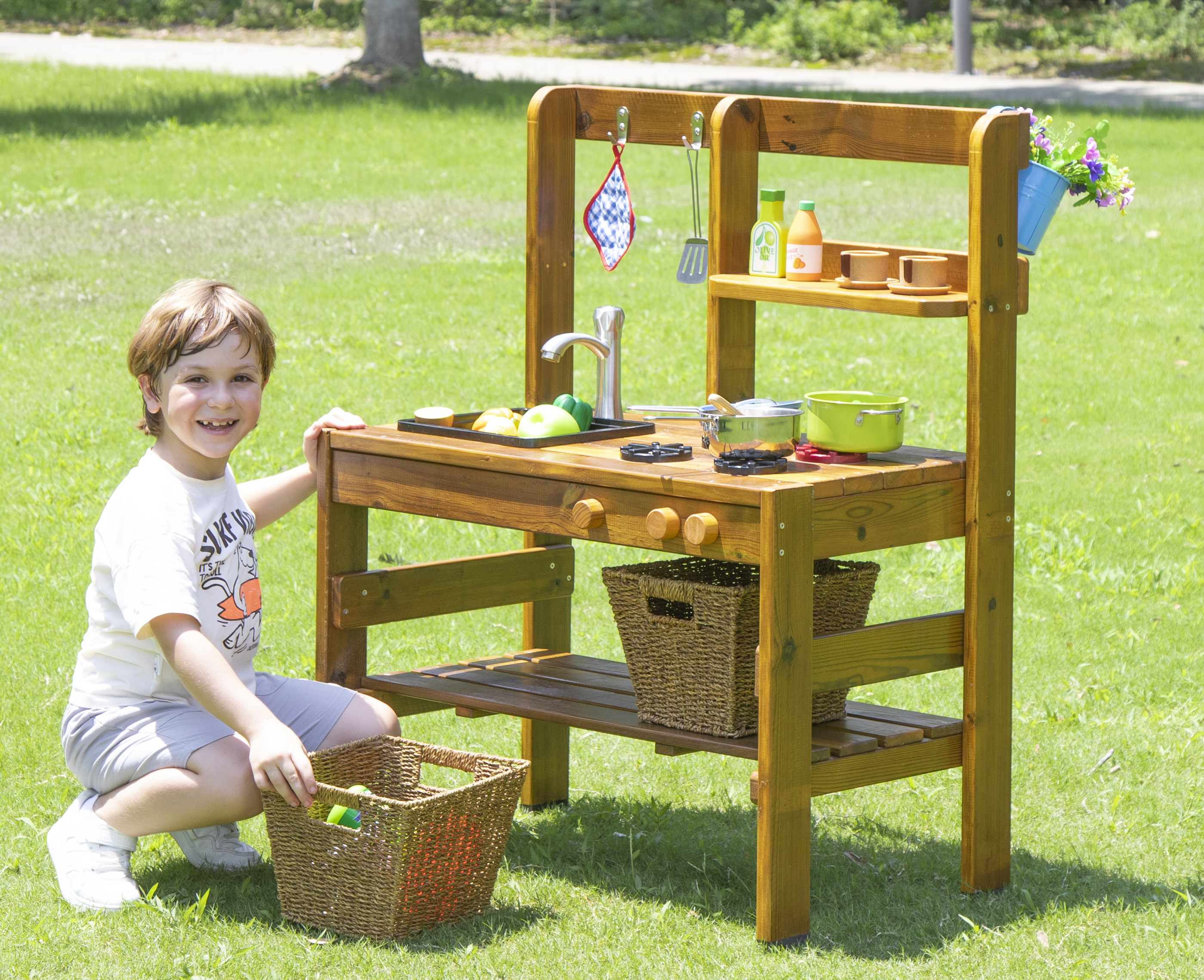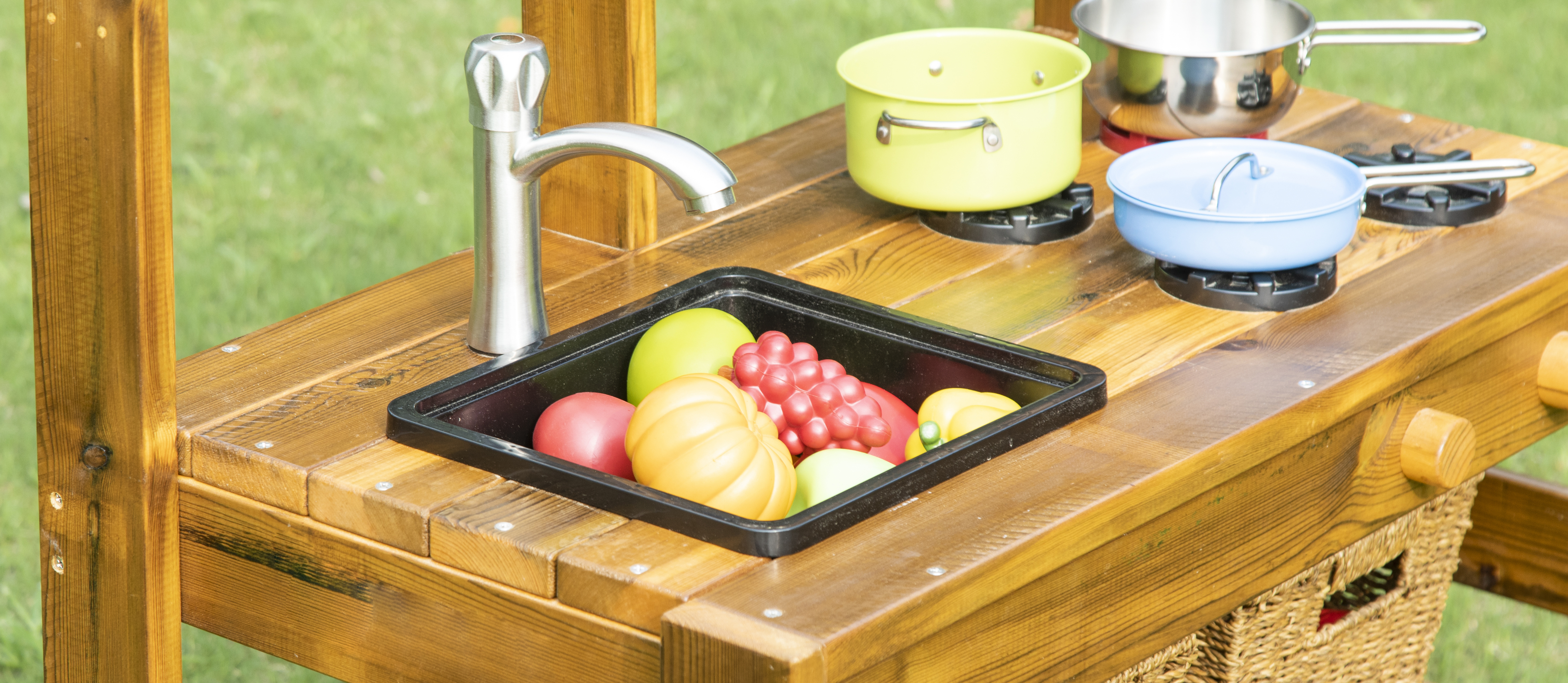Mit der stabilen, speziell für Kindergärten konzipierten Outdoor-Küche bringen Sie Kreativität und Rollenspiel nach draußen. Die Spielküche bietet Platz für mehrere Kinder und sorgt mit vier Kochfeldern und einem funktionsfähigen Edelstahl-Wasserhahn (anschließbar an einen Gartenschlauch) für ein authentisches Spielvergnügen. Die wetterfeste und langlebige Konstruktion fördert die Fantasie und das soziale Miteinander der Kinder und garantiert stundenlangen Spielspaß im Freien.