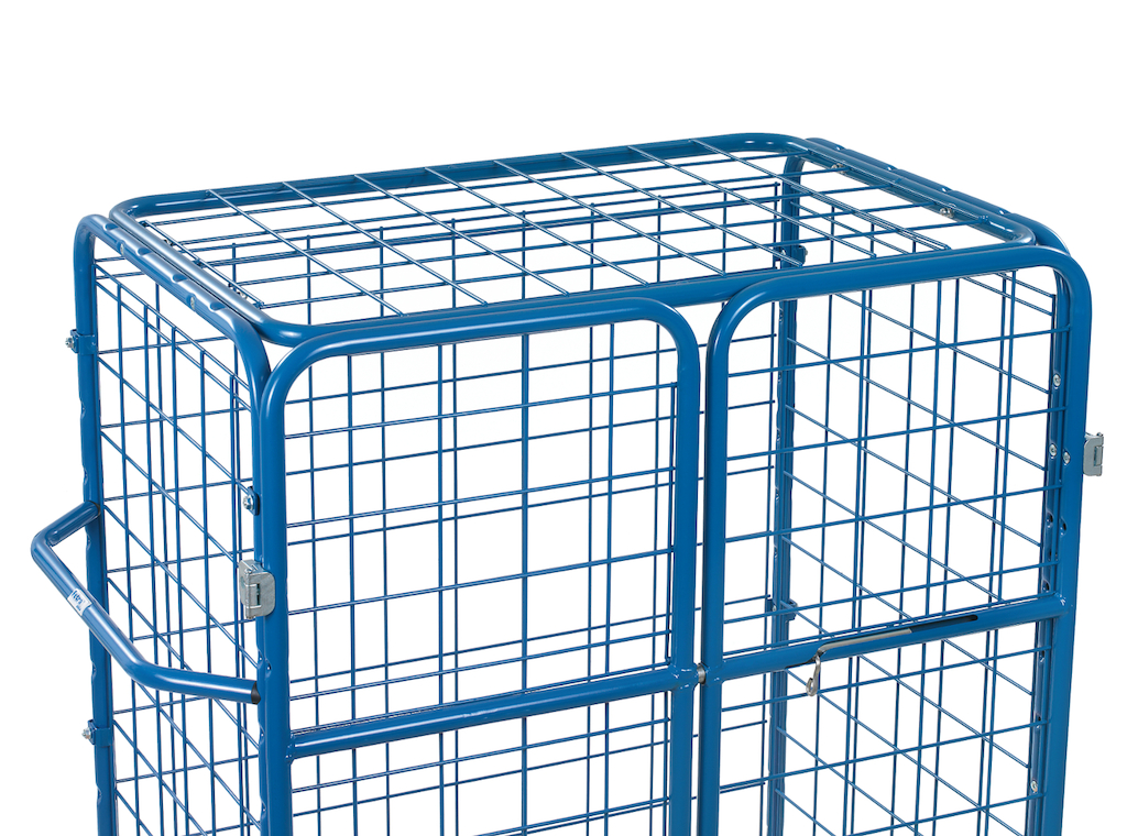 Die Stirnwände, die Rückwand, das Dach und die Doppelflügeltür sind mit in Stahlrohrrahmen eingeschweißten Drahtgittern geschlossen. Die geöffneten Türflügel lassen sich jeweils an die Stirnwände klappen. Durch den in den Stahlrohrrahmen integrierten Riegelverschluss lässt sich der Paketwagen mittels Vorhängeschloss (nicht im Lieferumfang enthalten) abschließen. Der Schiebegriff (beidseitig anschraub- und bei Bedarf abschraubbar) besteht aus Stahlrohr und die stabile Plattform aus einer im Profilrahmen liegenden Holzwerkstoffplatte, Oberfläche Buchendekor. Einlegeböden mit Auflagewinkeln, die im Raster von 100 mm variabel eingesetzt werden können, bei Bedarf bitte separat bestellen.