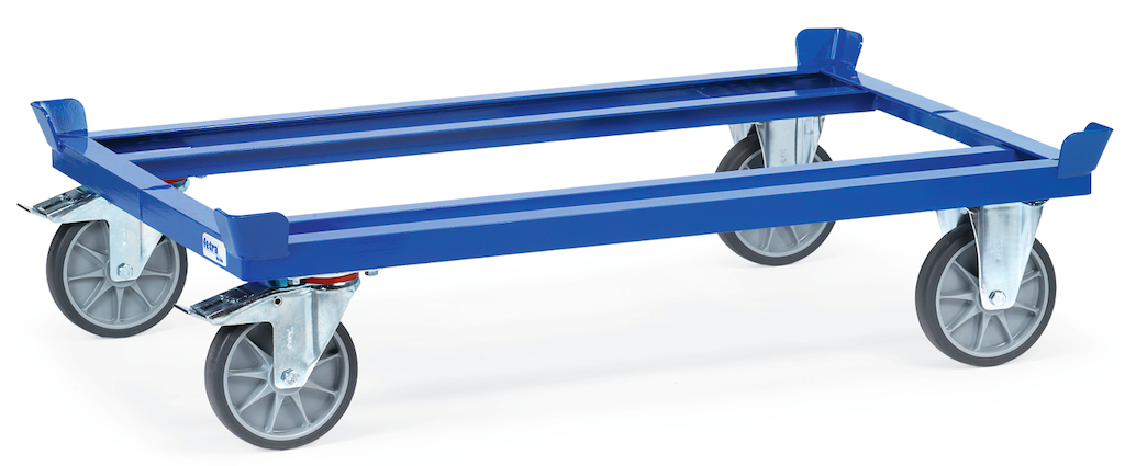 Das robuste Paletten-Fahrgestell mit einer Tragkraft von bis zu 750 kg besteht aus einer Winkelstahl-Schweißkonstruktion mit hochwertiger Pulverbeschichtung. Der umlaufende Rahmen mit um 20 mm abgesenkten Auflageprofilen und die vier Fangecken gewährleisten die sichere Aufnahme und den guten Halt der Paletten und Gitterboxen.