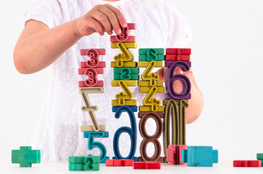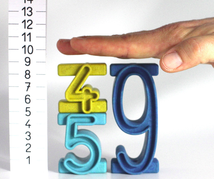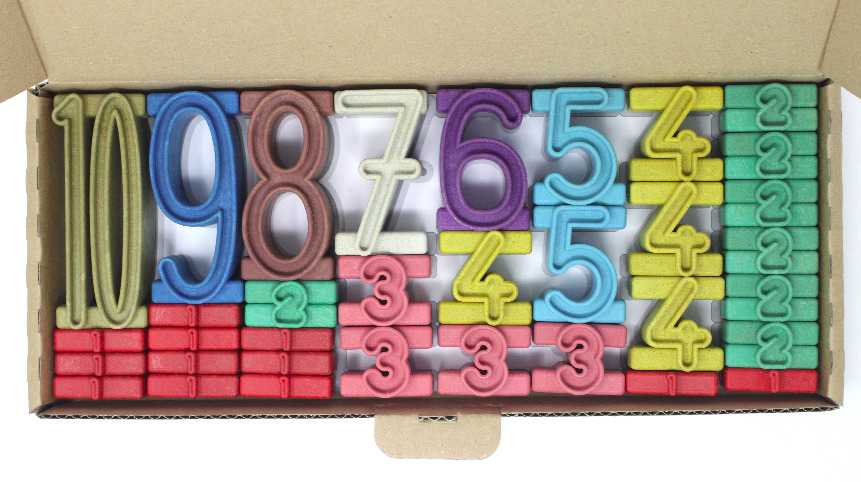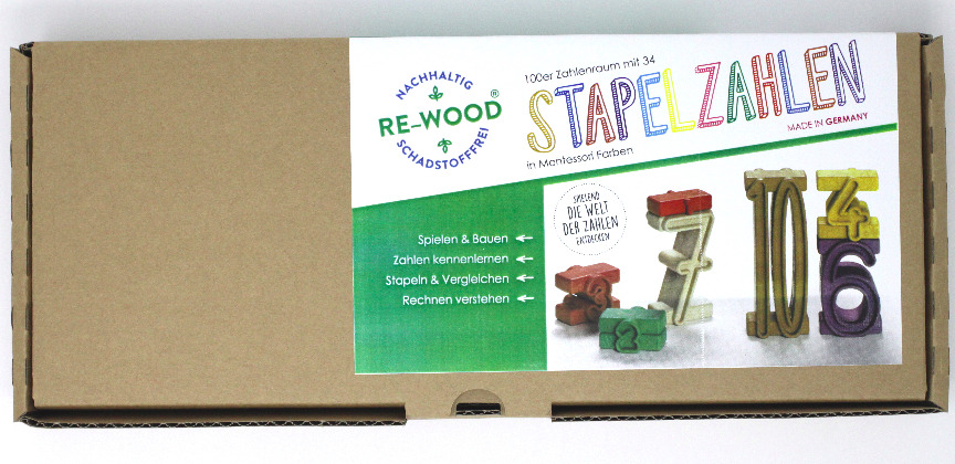 Satz aus 34 Stapelzahlen aus RE-Wood® in Montessori Farben. 12 x 1 (rot), 7 x 2 (grün), 4 x 3 (rosa), 4 x 4 (gelb), 2 x 5 (hellblau), 1 x 6 (lila), 1 x 7 (weiss), 1 x 8 (braun), 1 x 9 (blau), 1 x 10 (gold) ermöglicht 10 x den Wert 10 mit unterschiedlichen Stapelzahlen zu stapeln. Der Wert der Stapelzahlen entspricht der Höhe in Zentimeter. Alle Zahlen sind 4 cm breit und 3 cm tief.Verpackt im Karton inklusive Kontrolllineal und Anleitung.