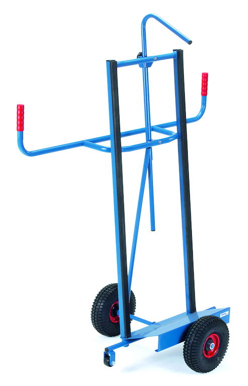 Der Plattenkarren in sauber verschweißter Stahlrohr- und Profilstahl-Konstruktion mit hochwertiger Pulverbeschichtung eignet sich besonders zum Längstransport großflächiger Holz- und Kunststoffplatten. Die Platten werden auf einer Stahlblechschaufel abgestellt. Zwei Stützrollen sorgen dafür, dass der Karren nicht nach vorne oder nach hinten kippt. Die Platten werden durch einen einstellbaren Niederhalter vor dem Kippen geschützt, die Anlagestreben sind mit rutschsicherem Profilgummi belegt.