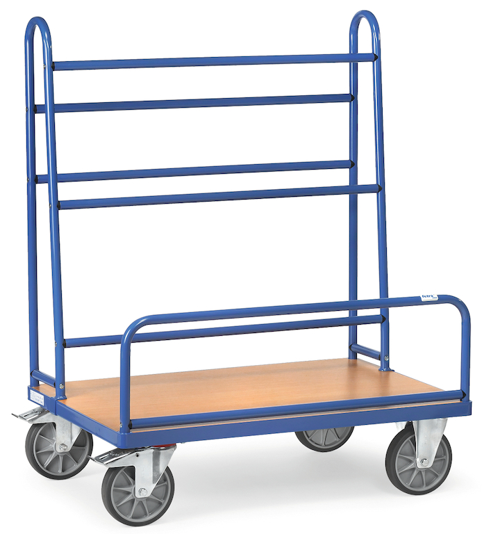 Der Plattenwagen ist in sauber verschweißter Stahlrohr- und Profilstahlkonstruktion mit hochwertiger Pulverbeschichtung gefertigt. Die Plattform besteht aus einer im Winkelstahlrahmen liegenden Holzwerkstoffplatte mit Oberfläche in Buchendekor. Der Aufbau aus verschraubtem Stahlrohr ist fest mit dem Winkelstahlrahmen verschweißt.