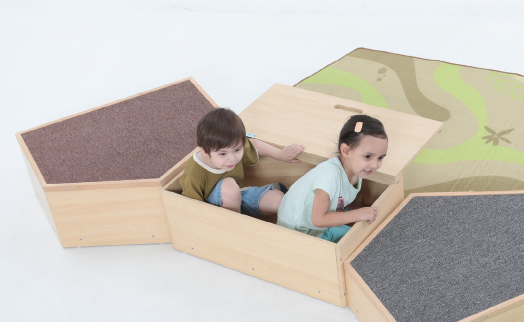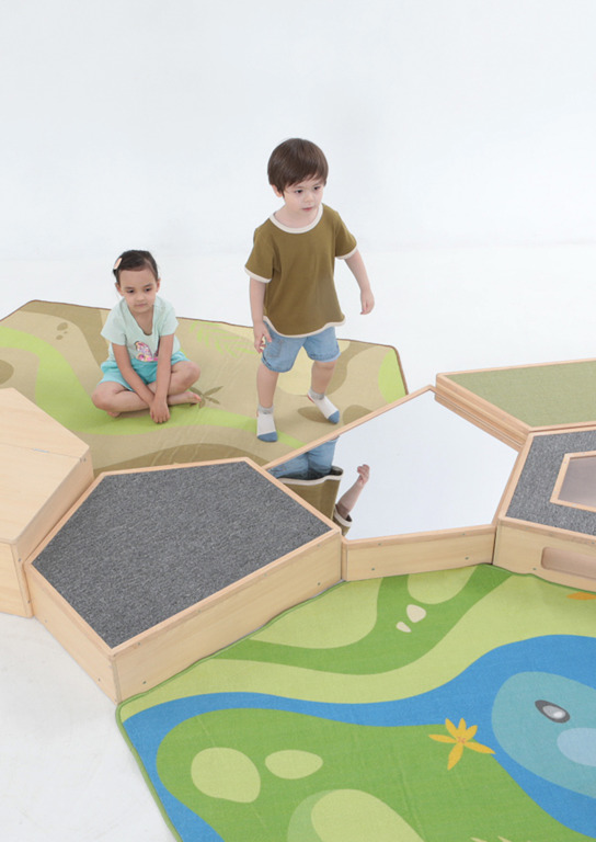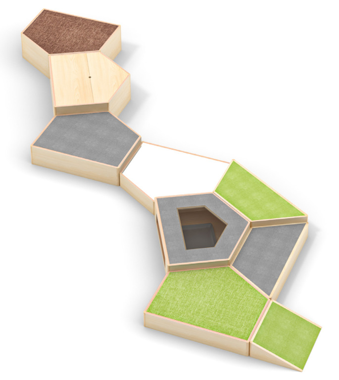 Das Set besteht aus 9 variabel einsetzbaren Elementen, sodass sie für jeden Raum passend angeordnet werden können: 8 Spielpodeste und 1 Rampe. Ausgestattet mit robustem Teppichbelag, bruchsicherem Spiegel, durchsichtigem Boden, Stauraum und / oder Beobachtungsfenster bietet eine aus den Elementen gestaltete Spiellandschaft Platz für mehrere Kinder zur gleichen Zeit - zum Toben, Entdecken und Wohlfühlen. Durch die verschiedenen Elementhöhen wird hauptsächlich der Gleichgewichtssinn gefördert und die unterschiedlichen Oberflächen werden besonders gut gespürt, wenn die Kinder barfuß darüber krabbeln oder laufen.