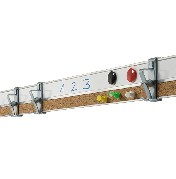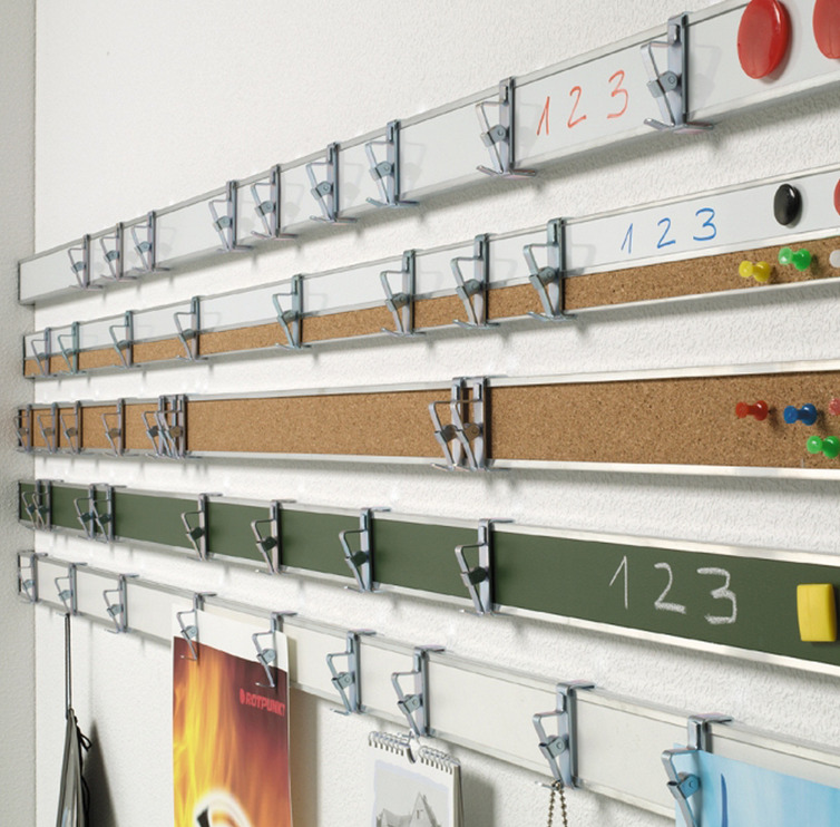 Die Bilderklemmleisten mit verschiebbaren Papierklemmen bieten eine hervorragende Möglichkeit, mit wenig Aufwand Bilder, Schriftstücke oder Informationen zu präsentieren und, je nach Oberfläche, zusätzlich Beschriftungen anzubringen. Besteht die Oberfläche aus Kork, dient die Leiste gleichzeitig auch als Pinwand.