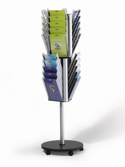 Drehbarer Bodenständer mit insgesamt 30 Prospektspendern für die Präsentation von A4 Informationen bis zum Überformat 311 x 240 mm. Auf 2 Etagen sind je 15 A4 Fächer eingehängt. Die Etagen lassen sich einzeln drehen. Leichtes Transportieren durch 5 Doppel-Lenkrollen mit Feststellern. Gesamthöhe: ca. 178 cm