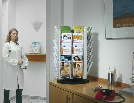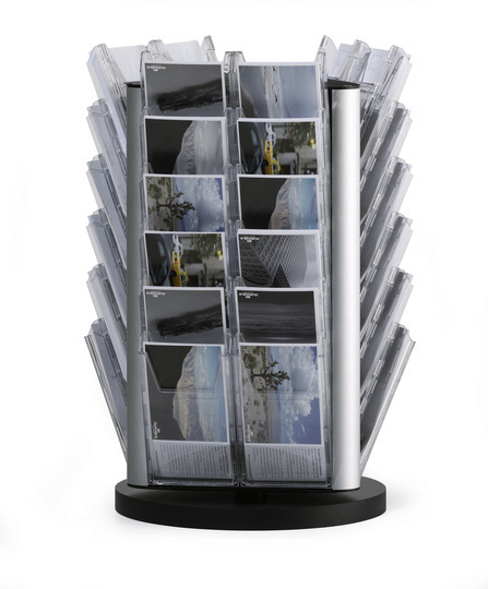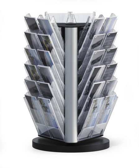 Die kugelgelagerten Drehelemente ermöglichen ein leichtes Drehen der Prospektspender. Die hochwertigen Aluminiumblenden geben Ihren Informationen einen zeitlosen Rahmen. Hohe Standfestigkeit durch stabilen, schweren Fuß. Mit 36 Prospektspendern, pro Seite sind je 12 Fächer eingehängt.