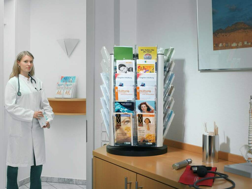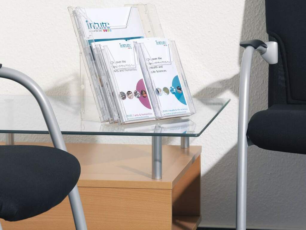 - Beliebig als Wand-Prospekthalter oder Tischaufsteller nutzbar