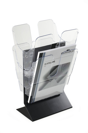 Tischständer mit 4 Prospektspenderschalen in modernem Design. Für die Präsentation von Informationen im Format A4. Maße mit 4 Prospektspenderschalen: 247 x 426 x 210 (B x H x T), Maße ohne Prospektspenderschalen: 247 x 337 x 150 (B x H x T)