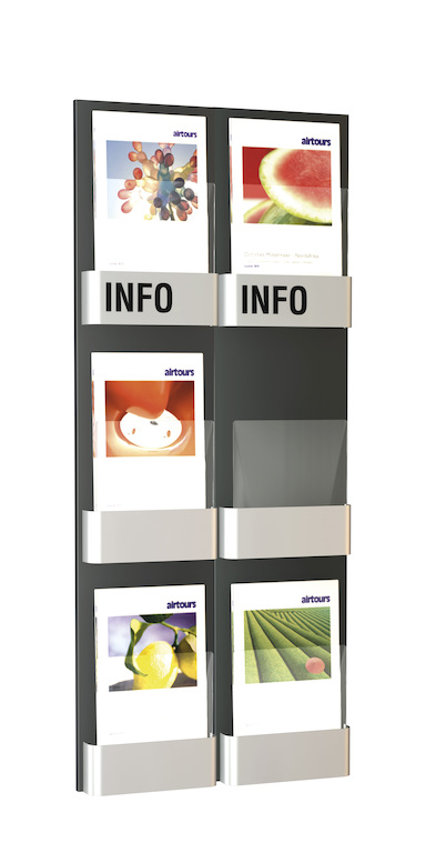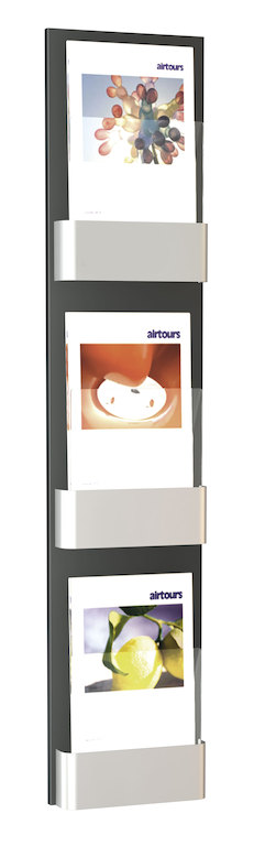 In die drei übereinander liegenden Fächer des Prospekthalters zur Wandmontage lassen sich Prospekte übersichtlich einordnen und ansprechend präsentieren.