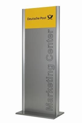 - An die flache Grundfläche aus silber eloxiertem Aluminium schließen runde, silber eloxierte Aluminium-Rundrohre (ø 78 mm) an. Beschriftung im Folienschnitt oder Digitaldruck-Technik.