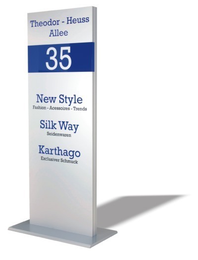 Komplett aus Aluminium, silber eloxiert. Tiefe 50 mm. Beschriftung durch Folienschnitt oder 4-Farb-Digitaldruck-Technik