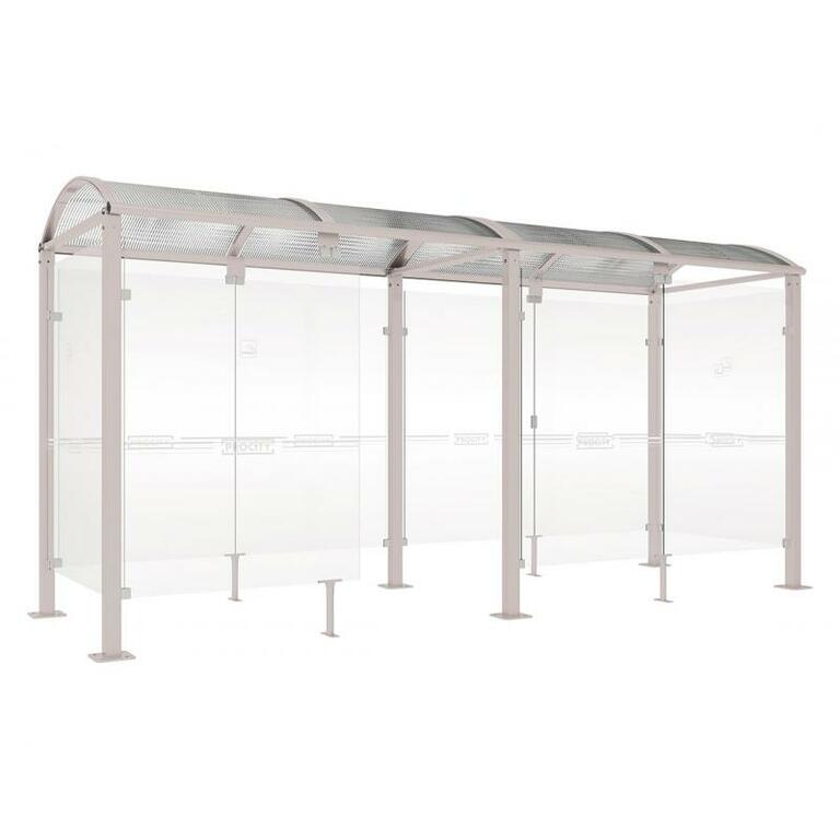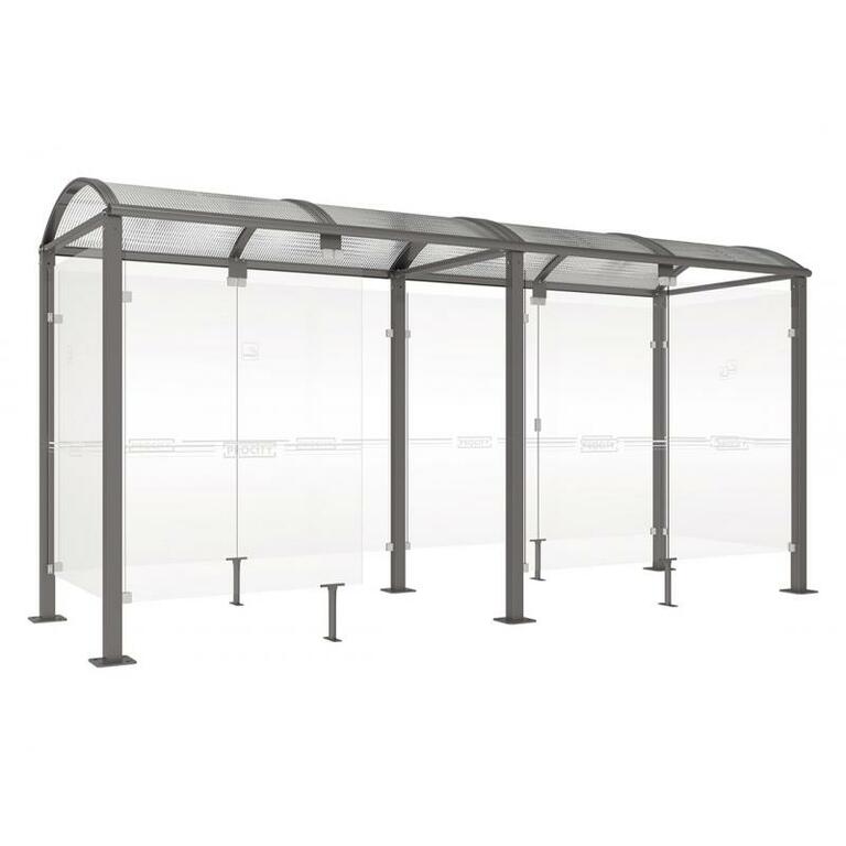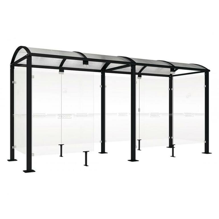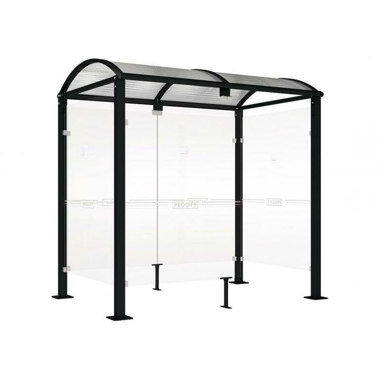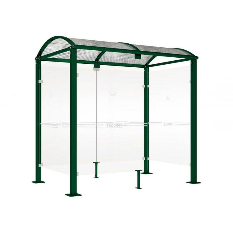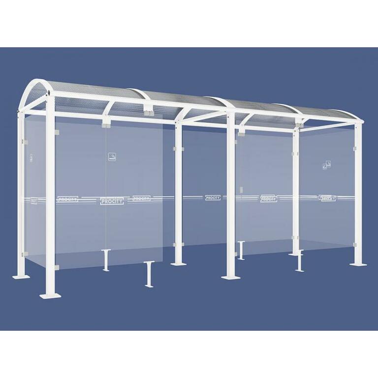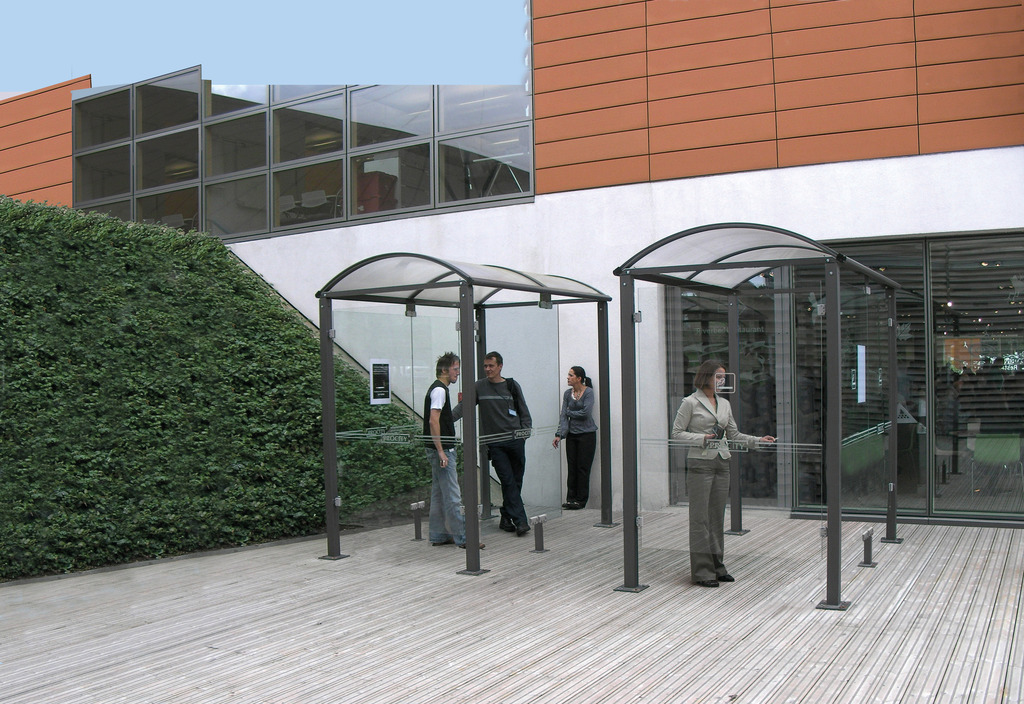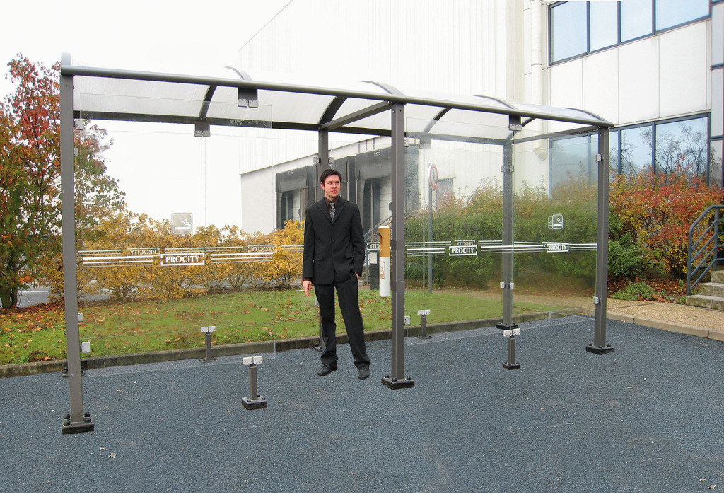 Raucherkabine Klassik ist ein funktionaler und geräumiger Raucherunterstand, der Rauchern Schutz vor Witterungseinflüssen bietet. Die Pfosten bestehen aus Stahlrohr 80 x 80 mm und sind auf Bodenplatten montiert. Die Dachstruktur besteht aus Aluminiumrohr-Streben und Rinnen aus Aluminiumprofil, während das Dach mit gewölbten Stegplatten aus UV-beständigem Polycarbonat bedeckt ist. Die Verkleidung besteht aus Sicherheitsglas und wird mit einem Klemmsystem befestigt. Die Ausführung erfolgt in feuerverzinktem und lackiertem Stahl. Optional sind Aschenbecher-Pfosten und Zigaretten-Aschenbecher erhältlich.
