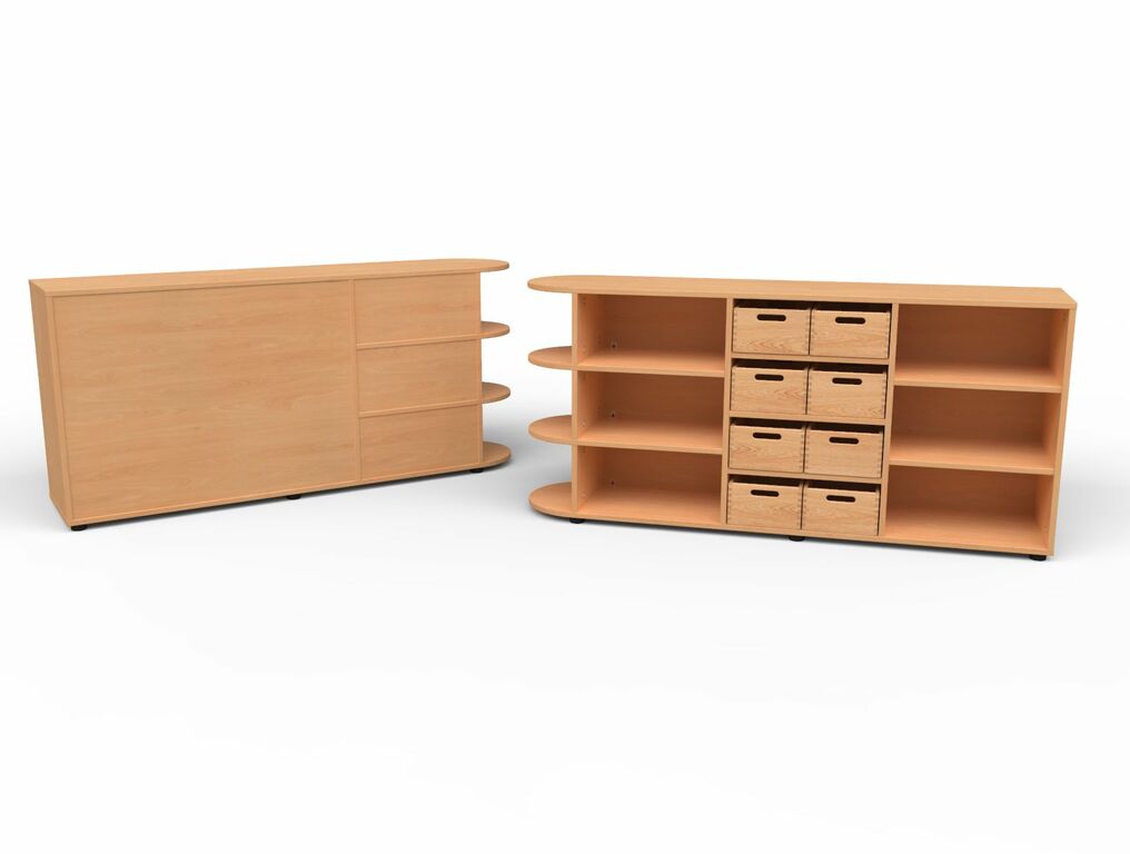 | Materialkästen | 2 Fachböden | 3 Fachböden mit 2 x 4 Materialkästen mit Griffloch | 2 Fachböden | Geschlossene Sichtrückwand seitlich mit halbkreis Regal mit je 2 festen Fachböden Ohne Sockel auf Stellfüßen stehend | |||