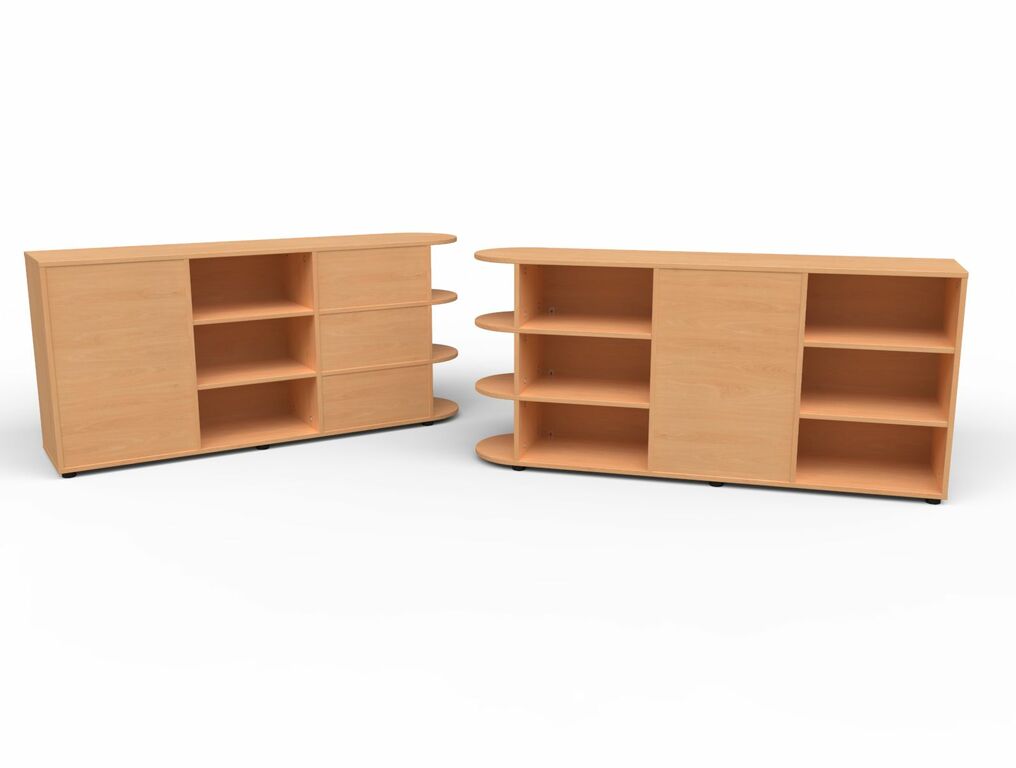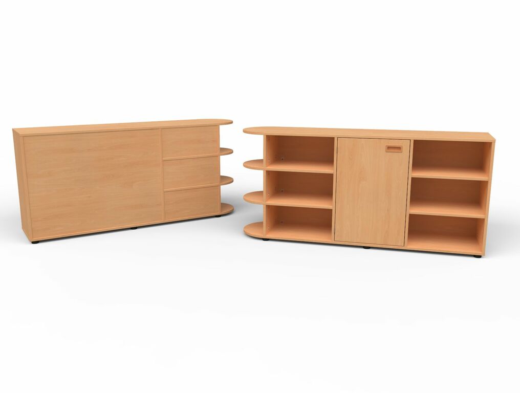 | Einlegeböden | 2 Fachböden | 3 Fachböden mit 2 x 4 Materialkästen mit Griffloch | 2 Fachböden | Geschlossene Sichtrückwand seitlich mit halbkreis Regal mit je 2 festen Fachböden Ohne Sockel auf Stellfüßen stehend | |||