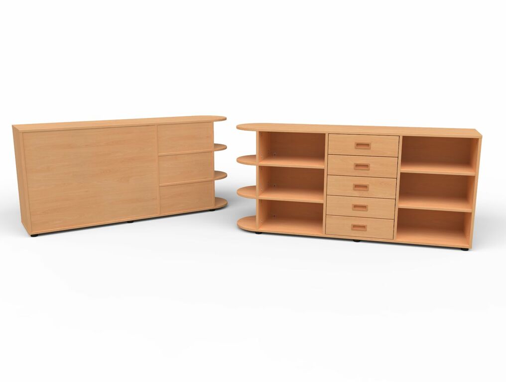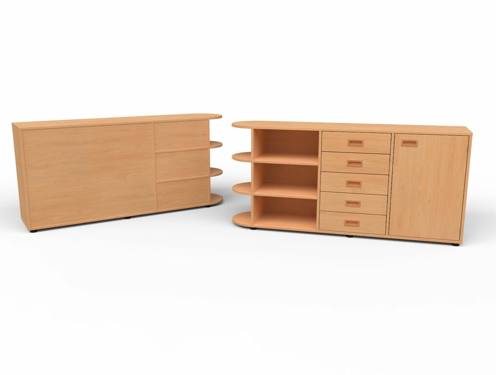 | Rechts: 5 Schubkästen und Links: 1 Tür | 2 Einlegeböden | 5 Schubkästen mit Muschelgriffen und SoftClose Auszügen | 1 Tür, Muschelgriff,2 Einlegeböden | Geschlossene Sichtrückwand seitlich mit halbkreis Regal mit je 2 festen Fachböden Ohne Sockel auf Stellfüßen stehend | |||