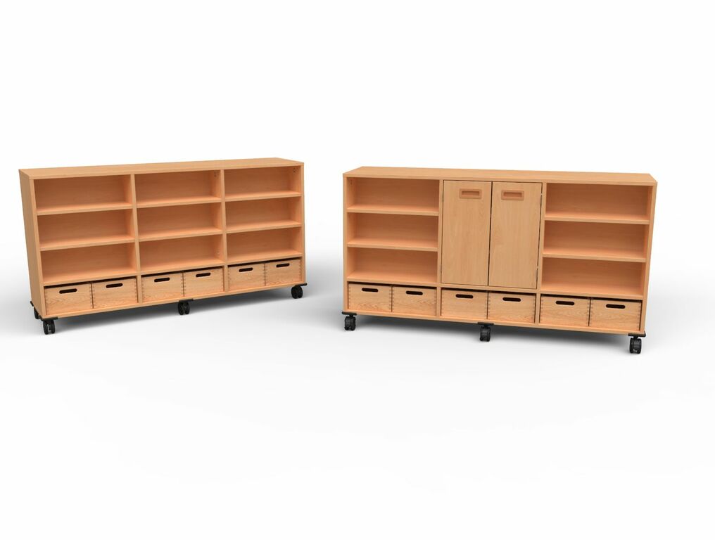 | Materialkästen | 2 verstellbare Einlegeböden | 2 Türen, nicht abschließbar, Muschelgriffe, 2 verstellbare Einlegeböden | 2 verstellbare Einlegeböden | 2 Trennwände, 6 Rollen, 2 davon feststellbar |