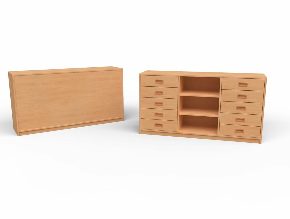 | 0-4R | 152 x 80 x 40 cm | 5 Schubkästen, Muschelgriffen | 2 verstellbaren Einlegeböden | 5 Schubkästen, Muschelgriffen | Sichtrückwand geschlossen. |