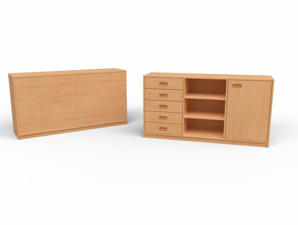 | 04-L | 152 x 80 x 40 cm | 5 Schubkästen mit Muschelgriffen | 2 Einlegeböden | 1 Tür, 2 Einlegeböden | Sichtrückwand geschlossen. |