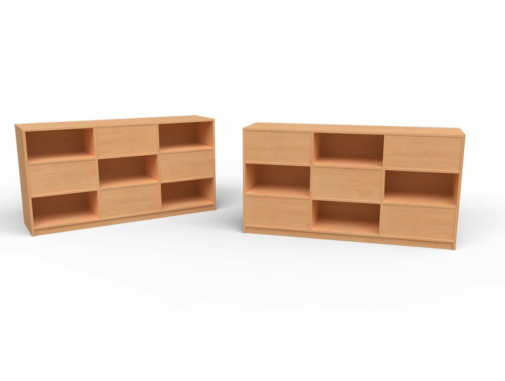 - Materialkästen. VORDERSEITE: Links und rechts: Offen, 2 verstellbaren Einlegeböden. Mitte: 2 türen, Muschelgriffe, 2 Einlegeböden. Geschlossen.Darunter: Offen, ohne Rückwand, 3x2 materialkästen. RÜCKSEITE: Offen, ohne 2 trennwände 3x3 Einlegeböden.