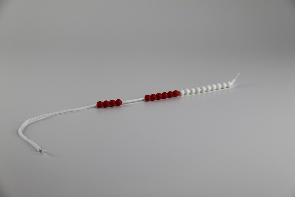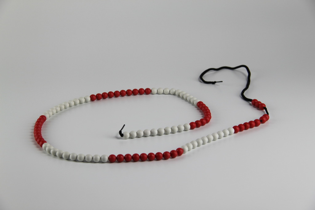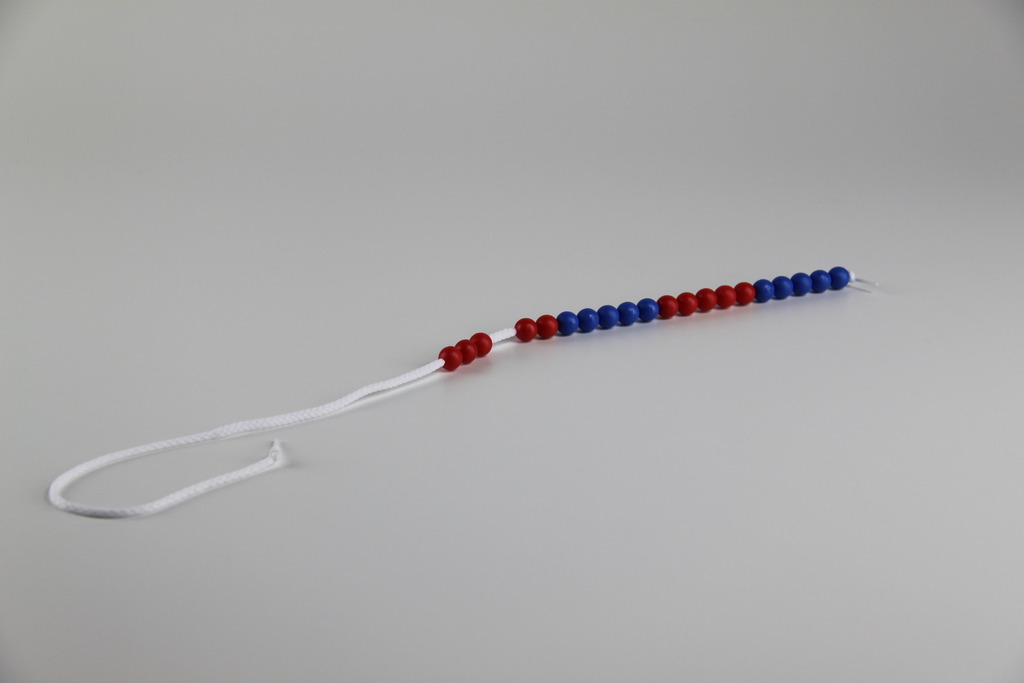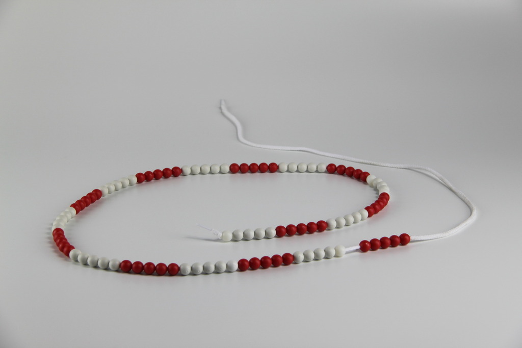 Kugeln in Fünfer- oder Zehnerschritten. Kunststoffkugel Ø 10 mm auf einer dehnbaren Schnur 45 cm bzw. 150 cm lang. Durch Ziehen wird die leichte Kugelarretierung aufgehoben. In den Farbkombinationen rot/blau und rot/weiß lieferbar. Riesenrechenkette mit KUgel 25 mm.