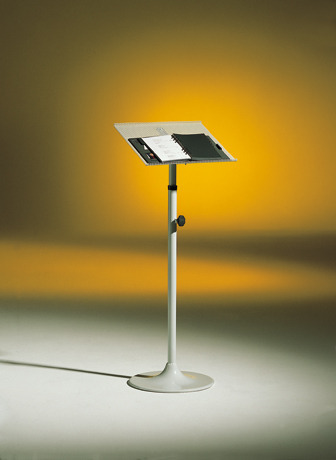 Die Manuskriptablage ist schräg aufliegend und aus Lochblech mit einer Abrutschschutzkante Alle Stahlteile sind epoxidharzpulverbeschichtet und in RAL 7035-Lichtgrau. Auf Wunsch kann eine andere RAL Farbe gewählt werden und oder eine Beleuchtung dazu bestellt werden.