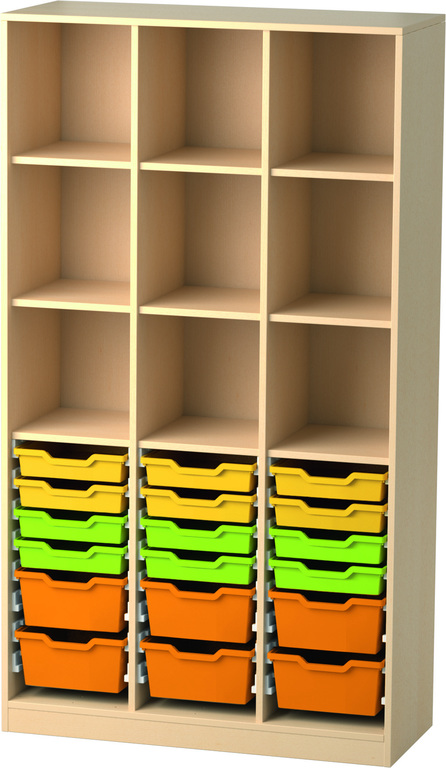 Pro Abteil: je 1 Konstruktionsboden, darüber 2 Einlegeböden (3 Ordnerhöhen), darunter 8 Schienenpaare für Materialboxen (bitte separat bestellen)
