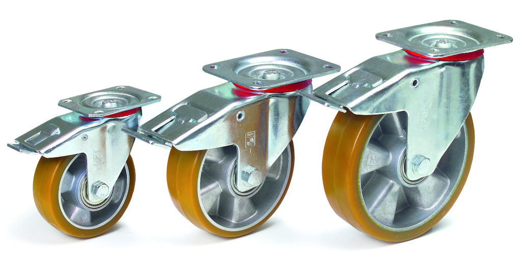 Lenkrollen, Lenkrollen mit Feststeller und Bockrollen auf Alu-Felgen. Naben mit Rillenkugellager. Gehäuse aus verzinktem Stahlblech.