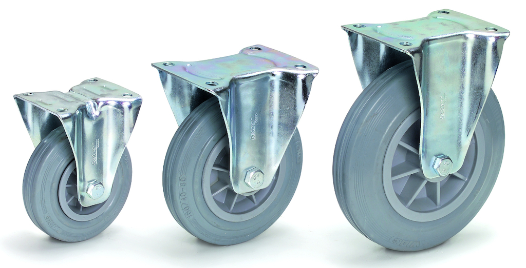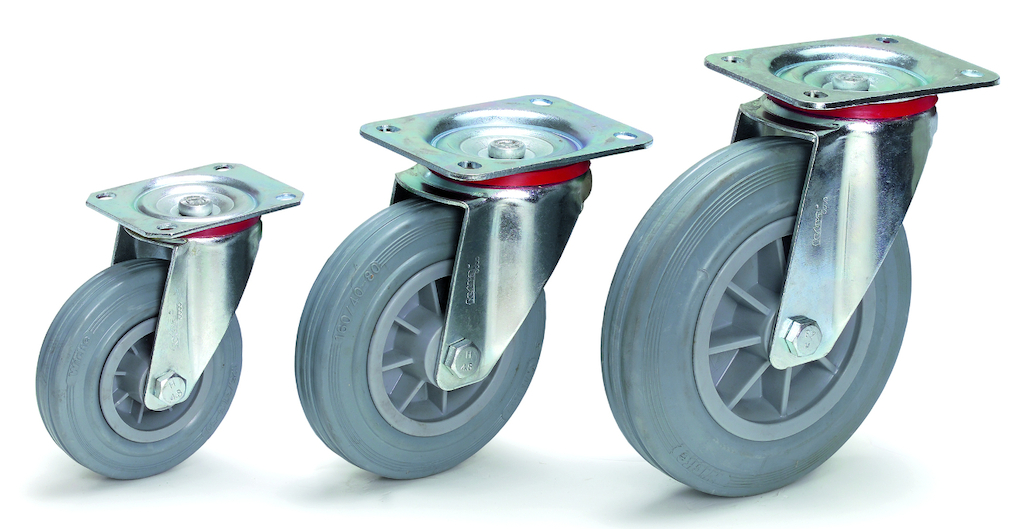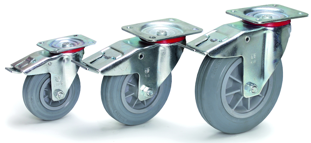 Lenkrollen, Lenkrollen mit Feststeller und Bockrollen auf Kunststoff-Felgen. Naben mit Rollenlager. Gehäuse aus verzinktem Stahlblech.