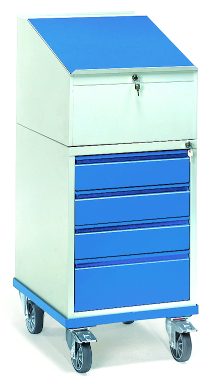 Mobiles Rollpult für Betrieb, Lager und Versand mit hochwertiger Pulverbeschichtung. Der pulverbeschichtete, abschließbare Stahlschrank ist mit vier Schubladen ausgestattet. Zum Einsetzen in die Schubladen sind optional Schubladen-Einteilungs-Sets erhältlich. Der Schreibpultaufsatz aus pulverbeschichtetem Stahl hat eine aufklappbare, mit einer Schreibunterlage beklebten Arbeitsplatte und ist ebenfalls abschließbar.