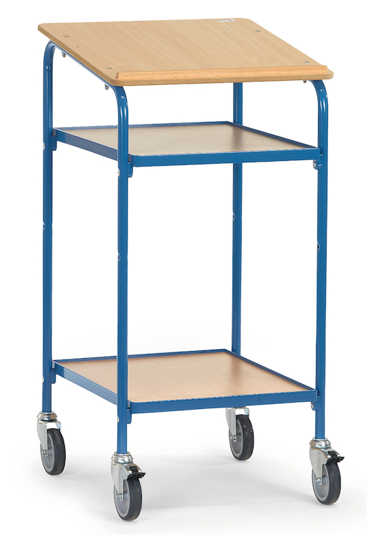 Mobiler Arbeitsplatz für Betrieb, Lager und Versand. Das Rollpult in sauber verarbeiteter Stahlrohr- und Profilstahl-Schraubkonstruktion mit hochwertiger Pulverbeschichtung ist mit einer Schreibfläche aus Holzwerkstoffplatte mit Anschlagleiste und zwei variabel einschraubbaren (z.B. in 2 Ordnerhöhen) Ablageböden aus im Profilrahmen liegender Holzwerkstoffplatte ausgestattet. Die Oberflächen der Platten bestehen aus Buchendekor.