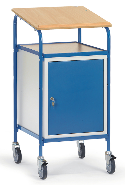 Mobiler Arbeitsplatz für Betrieb, Lager und Versand. Das Rollpult in sauber verarbeiteter Stahlrohr- und Profilstahl-Schraubkonstruktion mit hochwertiger Pulverbeschichtung ist mit einer Schreibfläche aus Holzwerkstoffplatte, Oberfläche Buchendekor, mit Anschlagleiste und einem pulverbeschichteten Stahlschrank mit Flügeltür, 3 Fachböden und Sicherheitsschloss ausgestattet.
