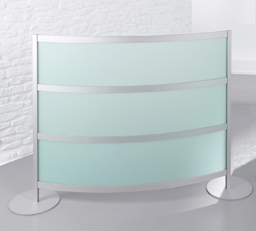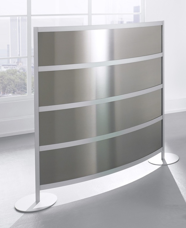 Die Diskretions-Stellwand SCREEN mit gebogenem Aluminium-Profilrahmen Typ C aus der Serie Stellwände & Paravents SCREEN ist leicht und trotzdem verwindungssteif und solide. Sie ist mit zwei Metallfußplatten zur freien Aufstellung ausgestattet. Wählen Sie die Höhe und die gewünschte Rahmenfarbe sowie Füllung aus.