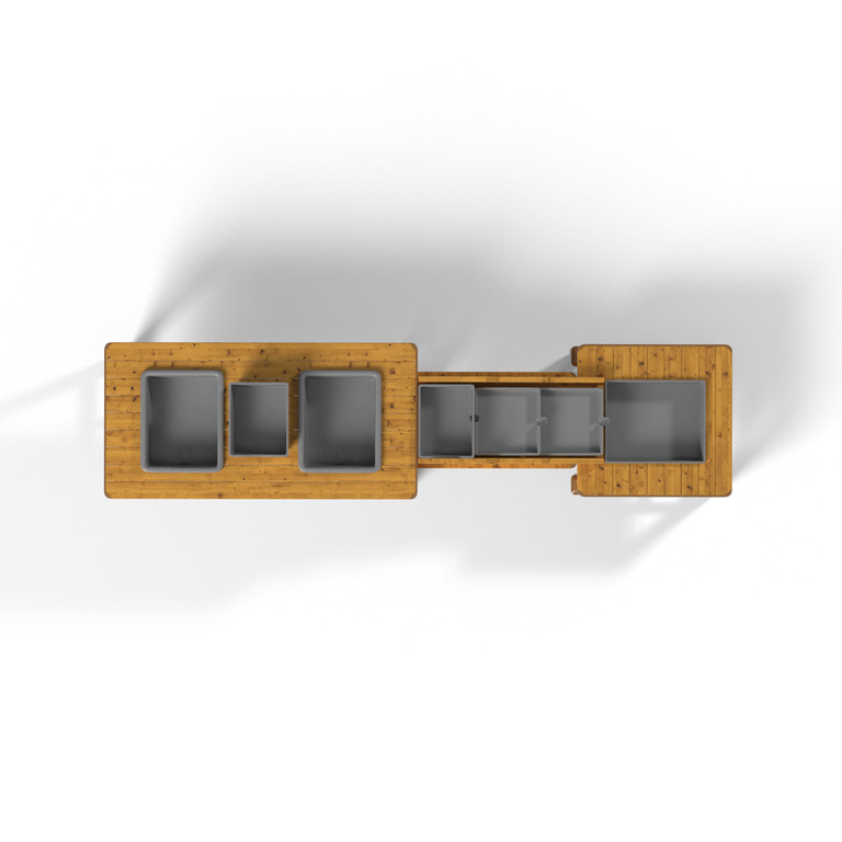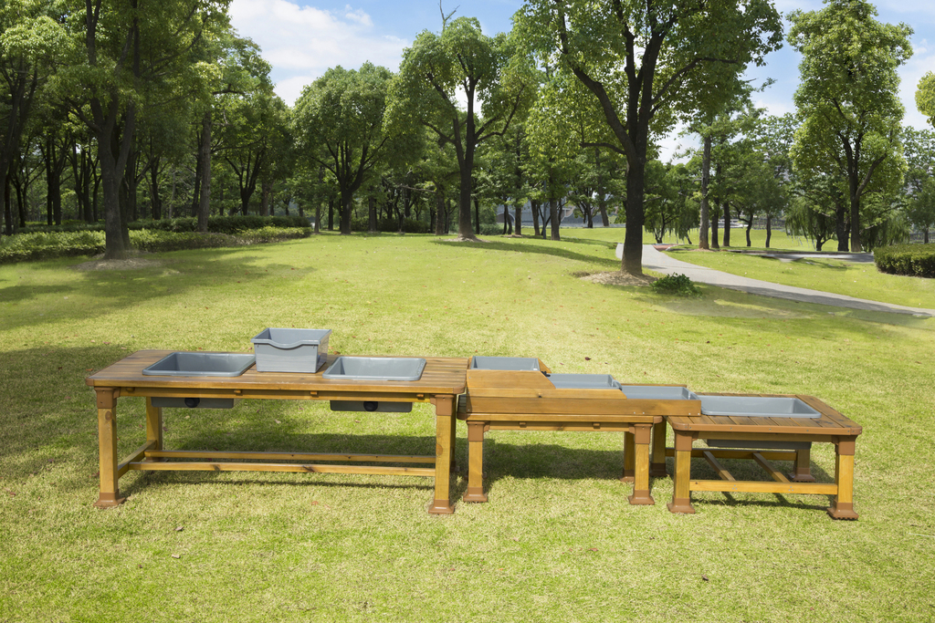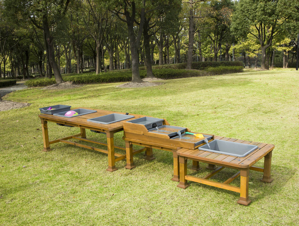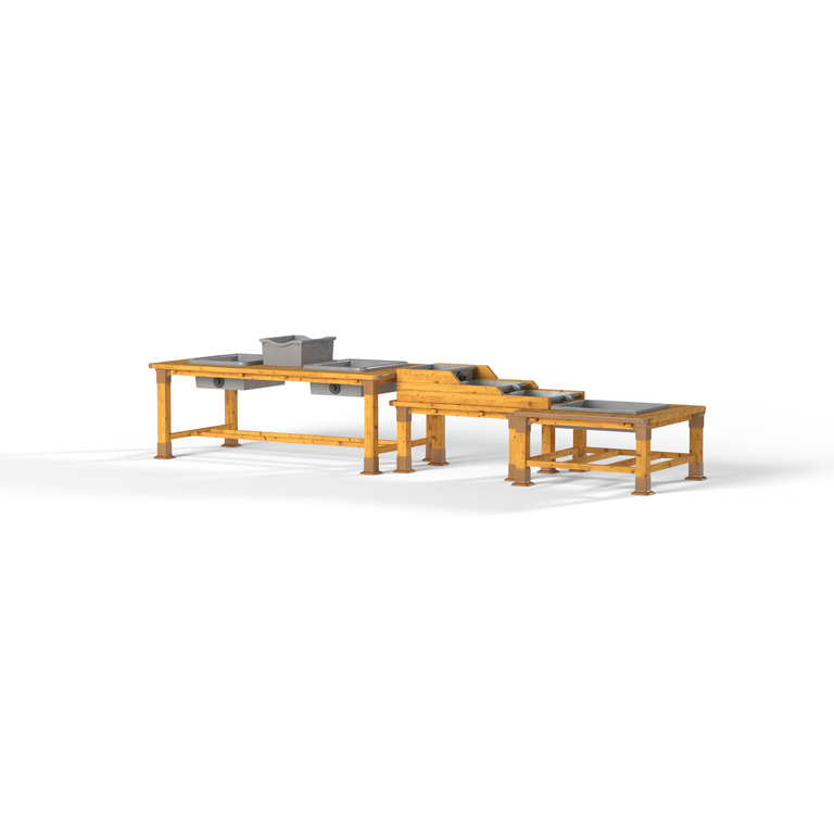 Die Matschanlage besteht aus einer Kombination aus drei Matsch-Tischen mit unterschiedlicher Funktion und ergibt eine Spielstraße, die zum Schöpfen, Schütten und Matschen einlädt. Die Anlage ist rundum bespielbar und eignet sich perfekt für Kindergruppen.