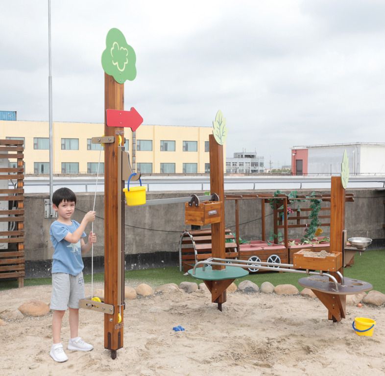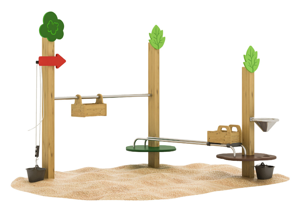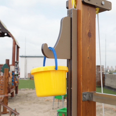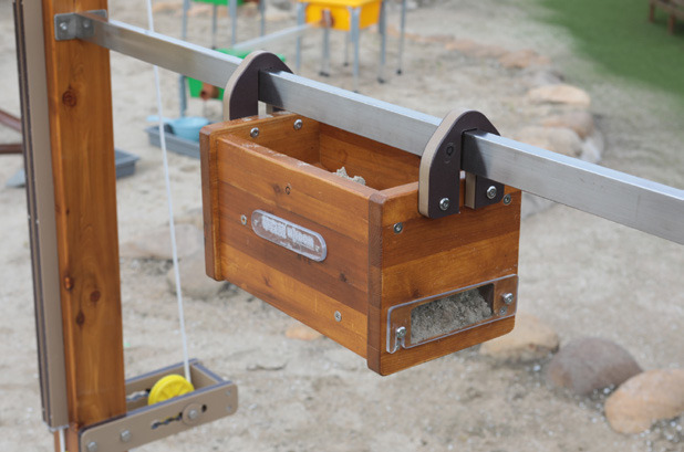 Mit der Sandspielanlage Baustelle wird Kindern ein äußerst praktisches und ergiebiges Spielerlebnis geboten. Mit dem Flaschenzug werden der Sand oder Matsch im Eimer nach oben befördert und dort in den Transportwagen umgeladen. Sofort geht es auf der Schiene hinüber zur Abladestation, wo der LKW bereits wartet. Dieser fährt den Inhalt des Transportwagens dann direkt zur Mischanlage, über die der Sand über einen Trichtr zurück in den Eimer befördert wird. Da die Sicherheit der Kinder an erster Stelle steht, wurden die Sandspielanlage nach DIN EN 1176 entwickelt und gebaut.